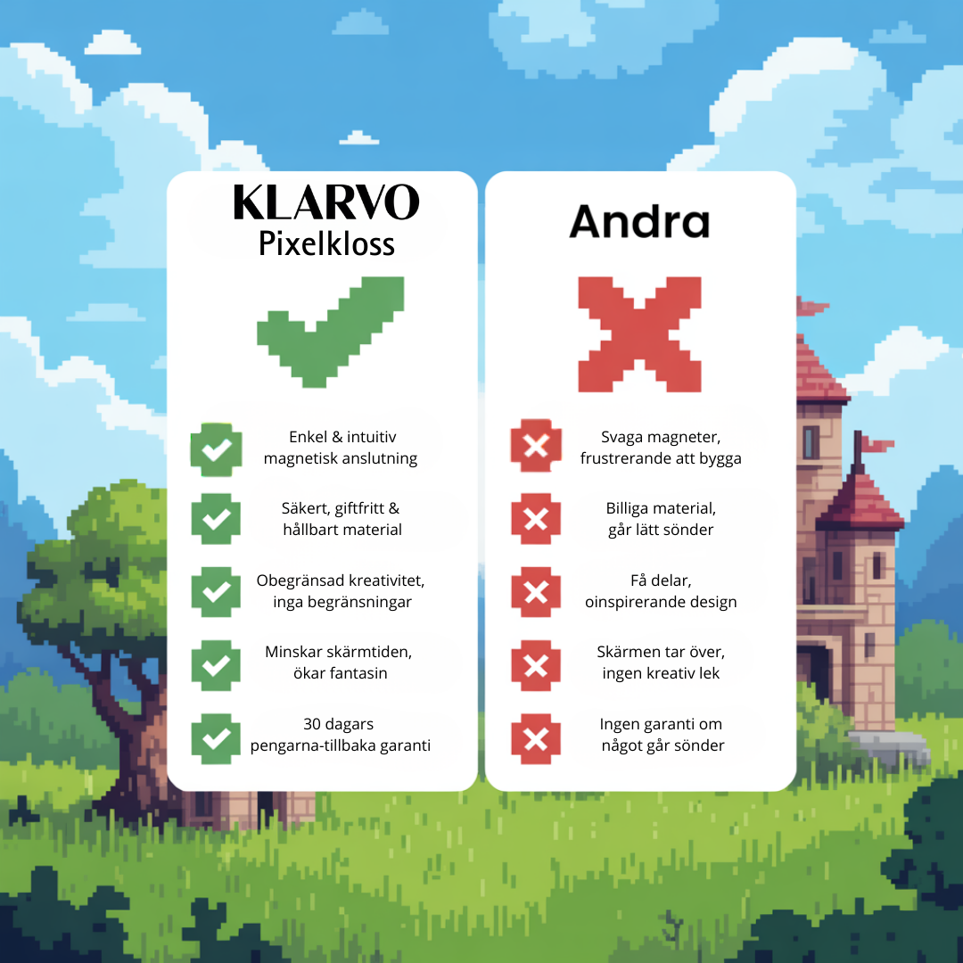 När barnen får lägga undan skärmen behövs något som verkligen engagerar. Klarvo Pixelkloss™ gör det enkelt: blocken klickar ihop med en tydlig känsla som gör att fantasin tar över direkt.
